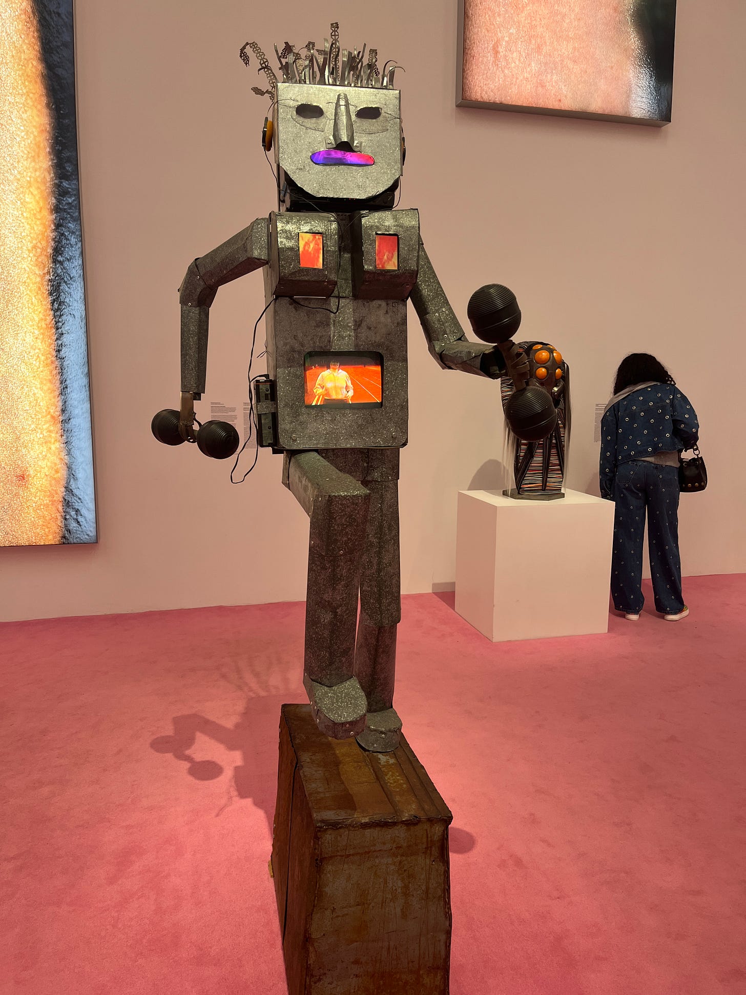 Kubota was making art largely from the 1960s-90s when analog video ran counter to the hyper-perfection of Hollywood and the purity of “film” as a distinct medium. She integrated video as possible for a multimedia palette—her robot sculpture loops video of her jogging, allowing what may feel a disparate form (video) to integrate into the shape of her self-portrait (as one of the many hardworking women who approach their body as a technology to be perfected / transformed / harnessed / maintained).
