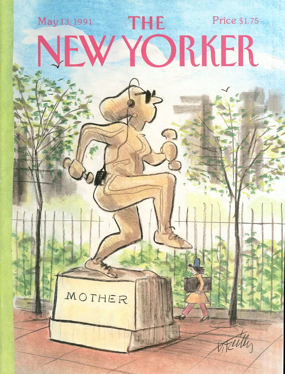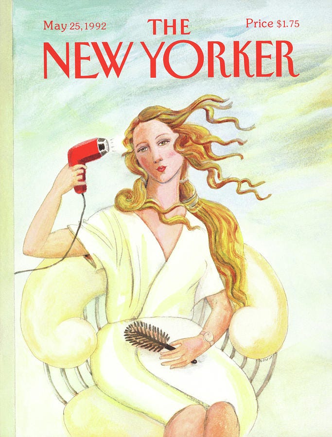 She said she was inspired by The New Yorker’s 1991 Mother’s Day cover for the sculpture, so I had to look it up, and after was curious to see the cover for the year I was born in ‘92. Both seem to be in conversation with Kubota’s piece and feature a technology whether that be a hairdryer or a walkman, which motivate these women towards an idealized gaze. Both feature women (particularly a “mother”) who are almost unreal in their portrait—inhuman if you may—one a statue and the other a god (forget the dumpy (witchy?) artist woman walking in the background who looks like she’s going to be crushed by the superhuman Mommy).